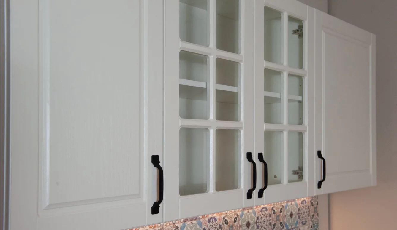 - Декоративная фрезеровка подчеркивает утонченный образ кухни. Витрина со стеклами смотрится изящно.