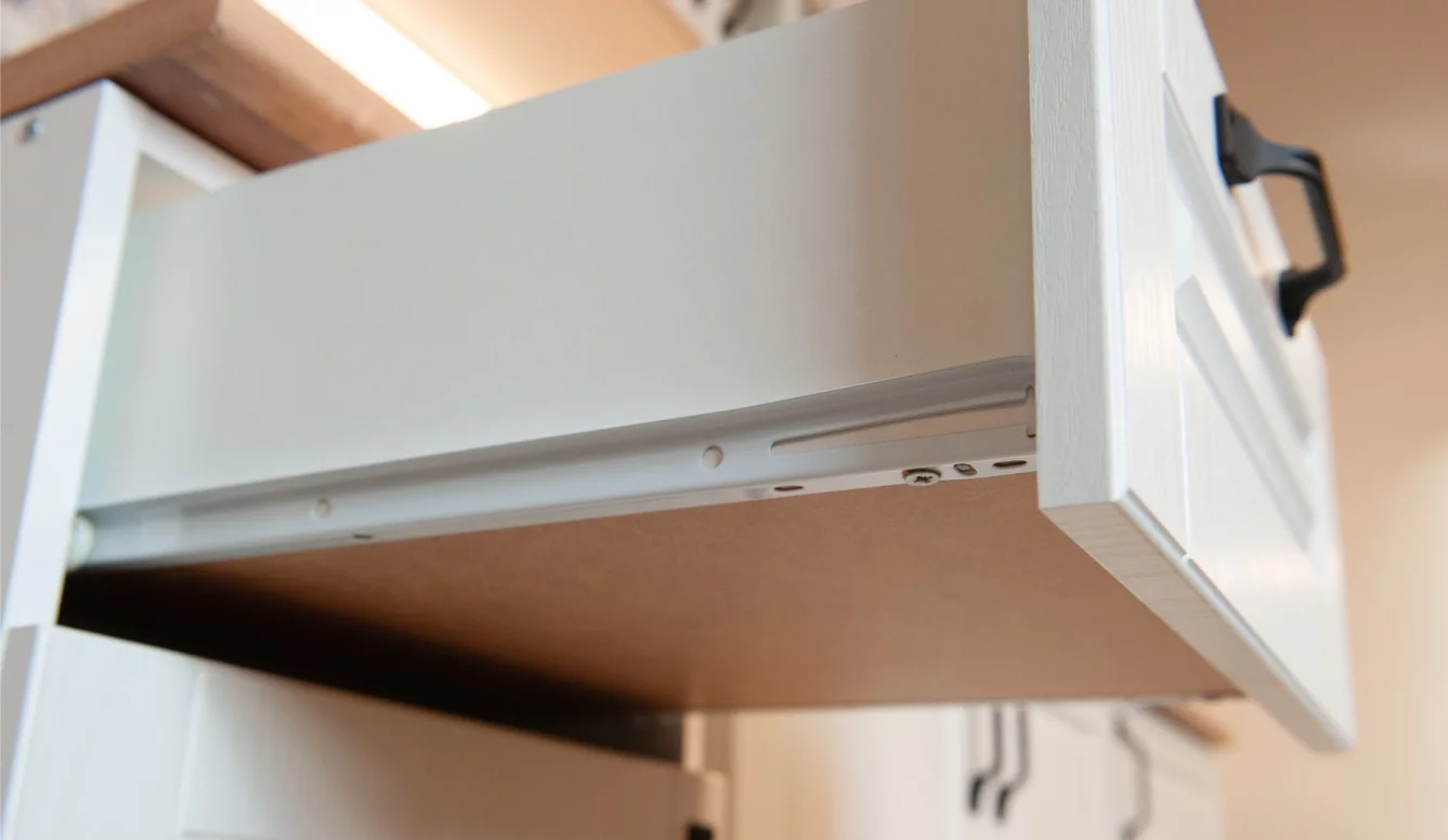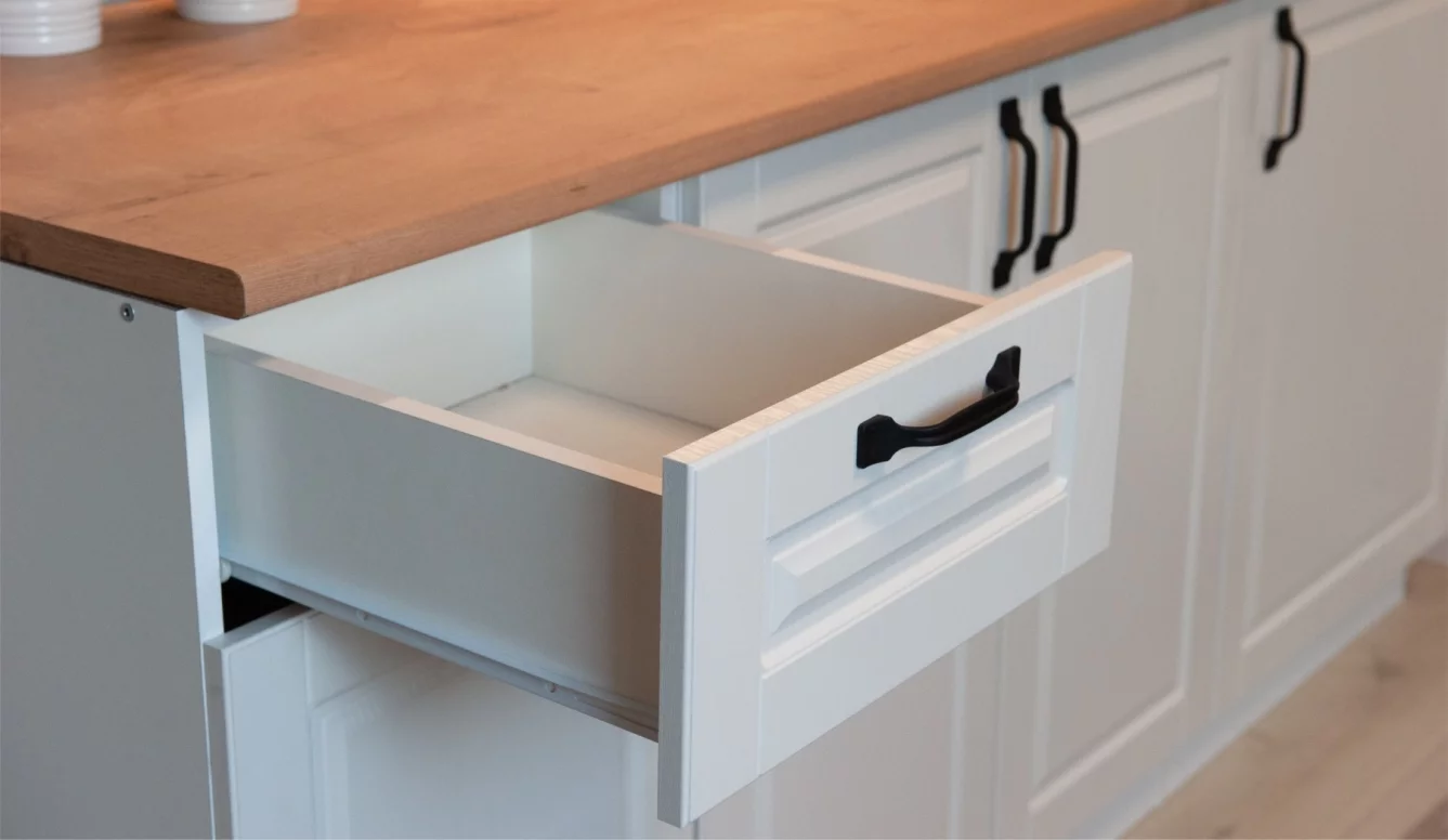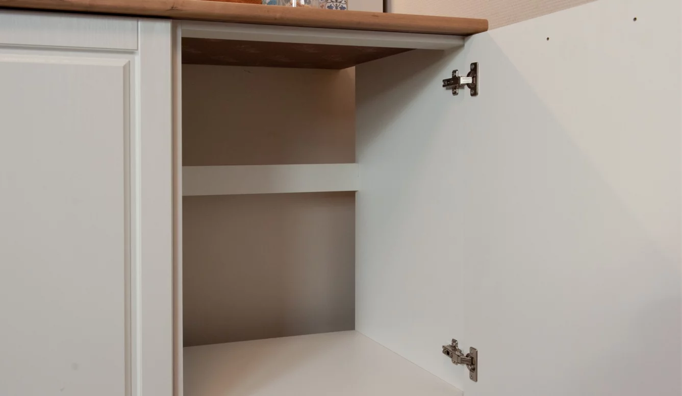 - Белый цвет фасадов с рисунком и текстурой натурального дерева зрительно увеличивает помещение, добавляет света и простора.