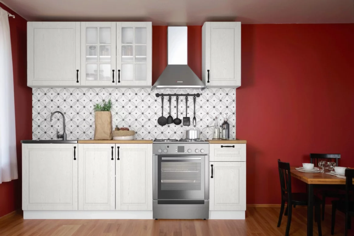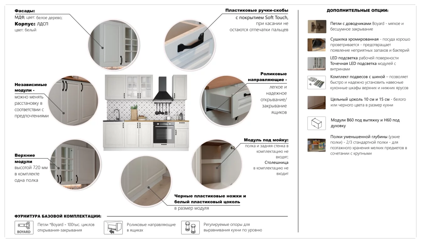 - При необходимости кухню можно доукомплектовать модулями под вытяжку и духовку. Столешница, стеновая панель и подсветка в комплект не входят.